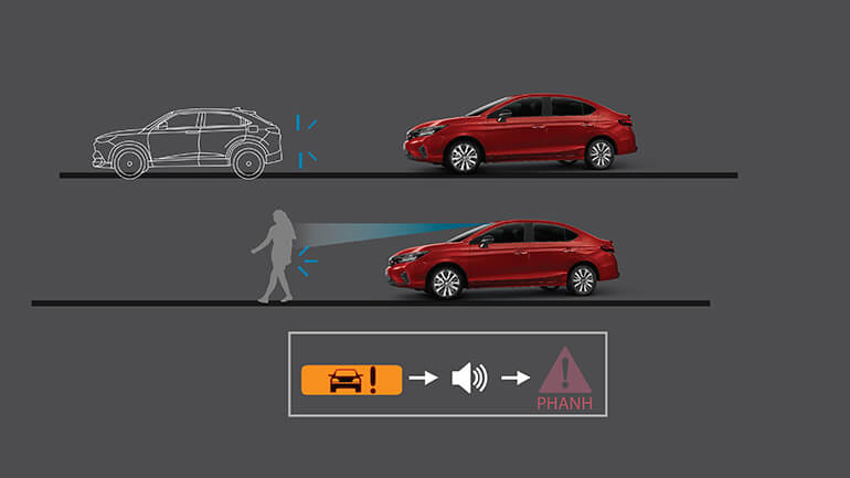 Hệ thống phanh giảm thiểu va chạm (CMBS): Cảnh báo người lái khi phát hiện vật cản phía trước. Ngoài ra, trong trường hợp người lái không thể tránh khỏi va chạm, hệ thống sẽ tự động phanh để giảm thiểu thiệt hại.